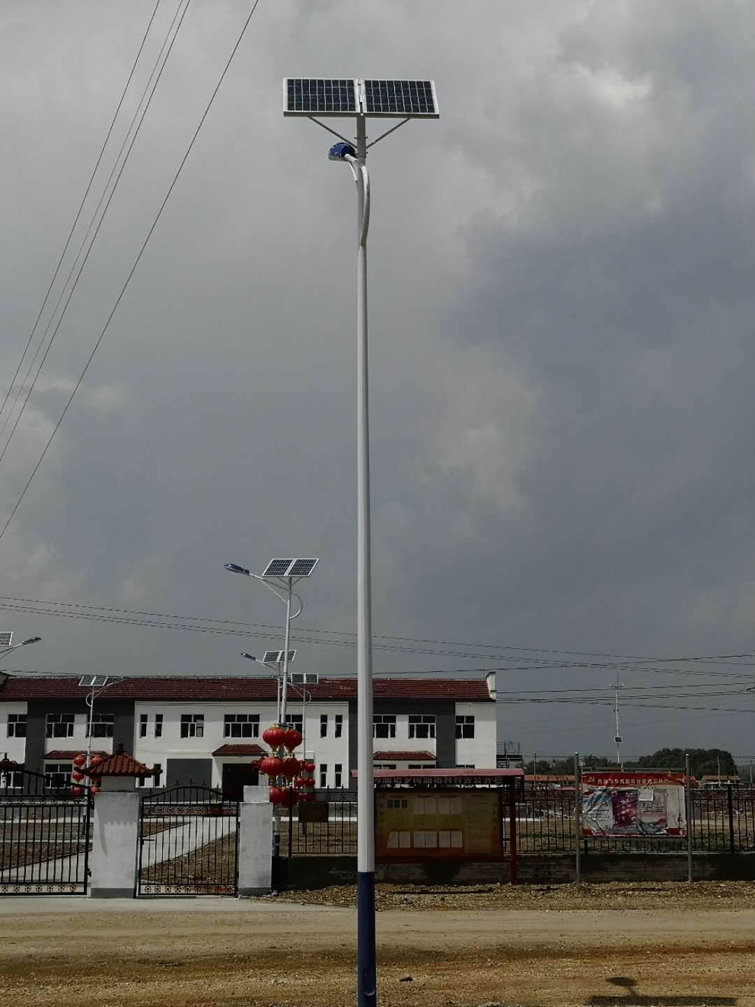 生產(chǎn)的兩塊太陽(yáng)能電池板,燈桿高度8米,LED燈頭60瓦,亮度高,質(zhì)量好。